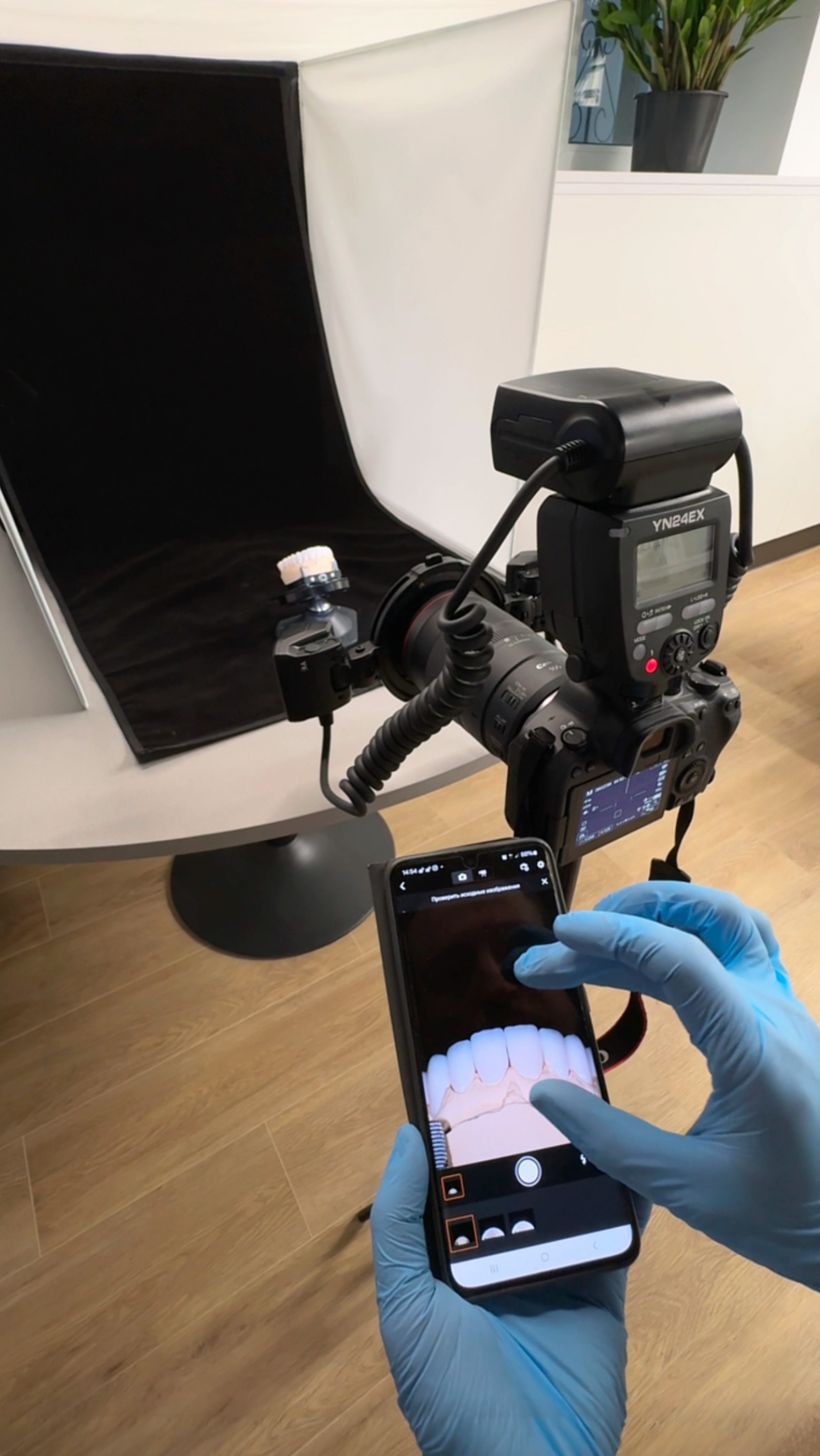 Студийное освещение. Правильное освещение — это основа качественной фотографии. Наше студийное оборудование обеспечивает равномерное, мягкое освещение без теней, что критично для точного воспроизведения цвета зубов и тканей. Это особенно важно при эстетическом планировании улучшений, где цветовая точность определяет успех финального результата.